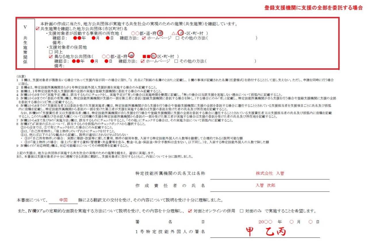 そこで、市区町村が実施する共生施策を踏まえた1号特定技能外国人支援ですが、1号特定技能外国人支援計画書(参考様式第1-17号)のⅣ支援内容の自由記入欄に記載していきます。